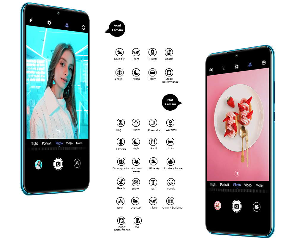 Give your photos a boost with powerful AI scene recognition technology. The HUAWEI P30 lite front camera can identify more than 8 categories in real-time while the rear camera can recognize 22 different categories. Settings like colour, lighting, and contrast are automatically adjusted to produce dazzling photos.
