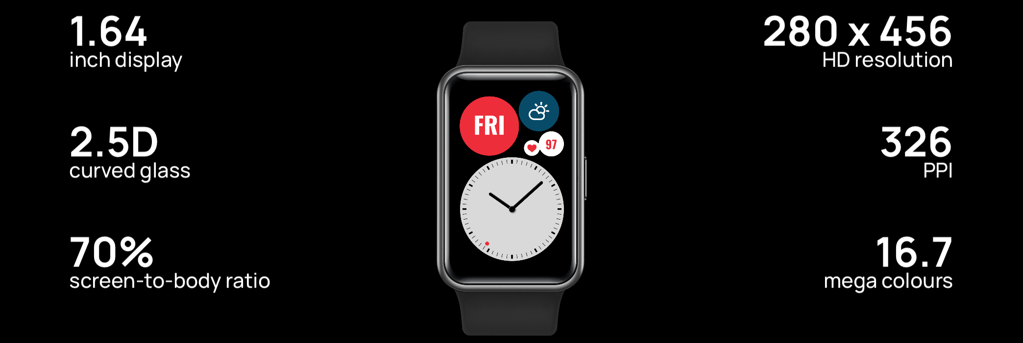 Ուղղանկյուն AMOLED-էկրանը HUAWEI WATCH FIT 1,64 դույմ անկյունագծով և 280 × 456 պիքսել բարձր լուծաչափով ապահովում է հստակ պատկերներ և լայն դիտման անկյուն: Ավտոմատ պայծառության կարգավորումը թույլ է տալիս ավելի լավ տեսնել էկրանը արևի ճառագայթների ներքո:
