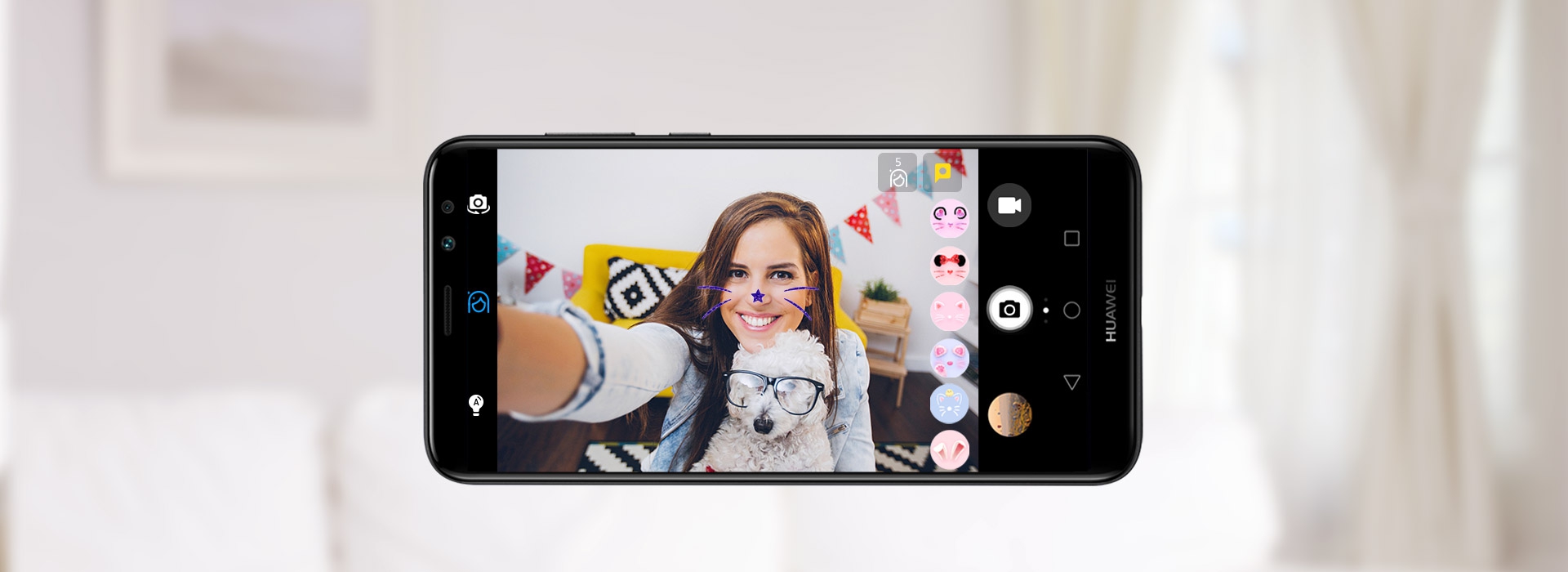 Միացրեք «Էֆեկտներ» ֆունկցիան HUAWEI nova 2i-ի տեսախցիկի հավելվածում և զվարճացրեք Ձեր ընկերներին: Ընտրեք Ձեզ առաջարկվող զվարճալի դիմակներից մեկը: