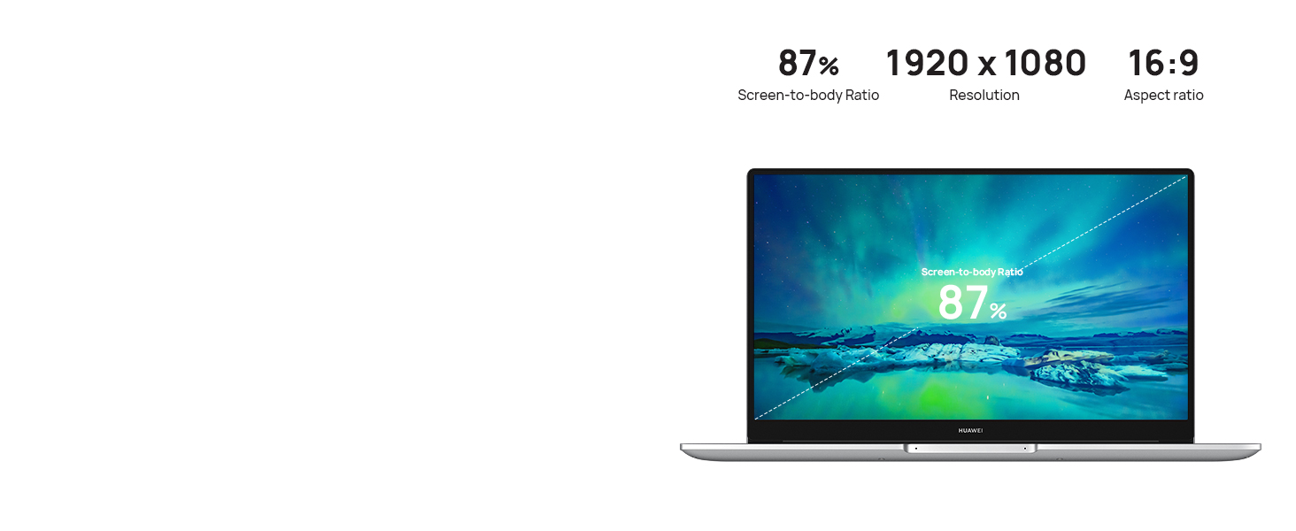 IPS 15.6” HUAWEI FullView էկրանը և 16:9 կողմի հարաբերակցությունը ձգում են տեսանելիության սահմանները, մինչդեռ Full-HD 1920 x 1080 լուծաչափը թույլ է տալիս յուրաքանչյուր պատկեր դիտել ավելի մանրամասներով և պարզությամբ: